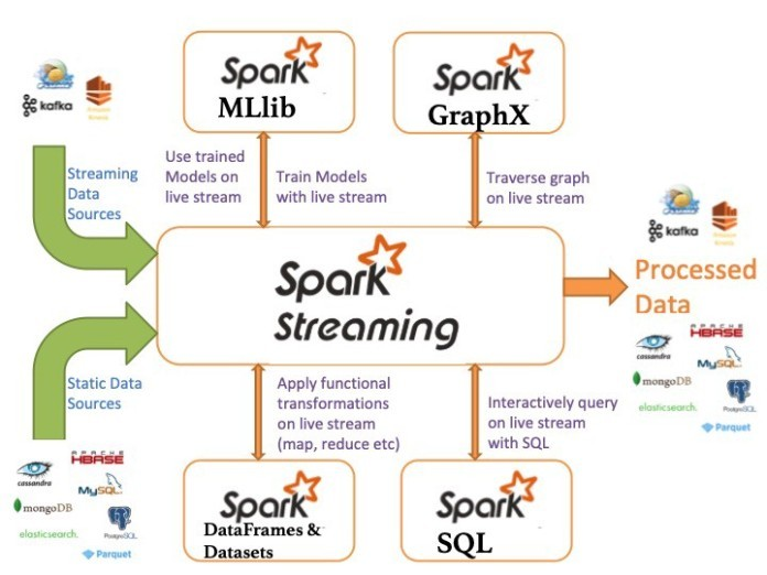 Spark Streaming là một extension của Spark Core API cho phép xử lý dữ liệu streaming có độ trễ thấp và khả năng chịu lỗi cao. Nó có thể xử lý dữ liệu từ nhiều nguồn như Kafka, Flume, Twitter, ZeroMQ, hoặc TCP sockets và có thể xử lý dữ liệu bằng các thuật toán phức tạp được thể hiện thông qua các hàm như map, reduce, join và window.