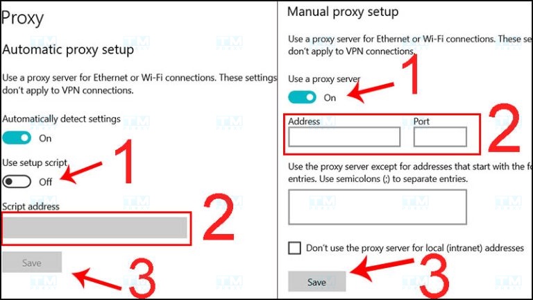 If Windows has difficulty detecting the proxy, you can configure it manually. In the Proxy settings, toggle Use a proxy server under Manual proxy setup to the on position. Instead of entering a script address, you will enter the IP address and port number of the proxy.