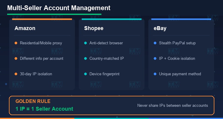 亚马逊: 极其严格。使用住宅或移动代理。30天内不要从同一IP登录2个卖家账号。每个账号需要完全不同的信息(邮箱、手机号、银行卡、地址)。