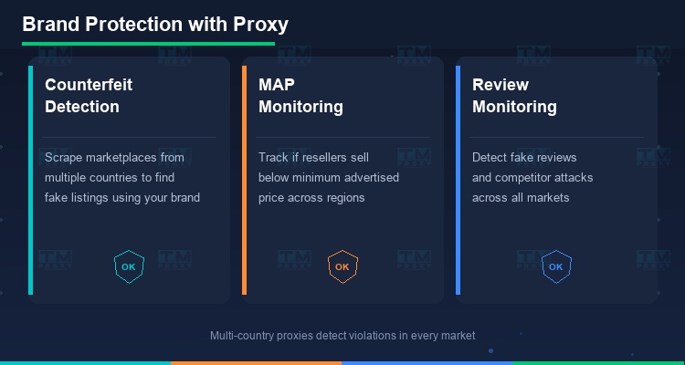假货检测: 从多个国家抓取电商平台,找到使用你品牌销售假货的listing。多国代理帮助在每个市场发现侵权。