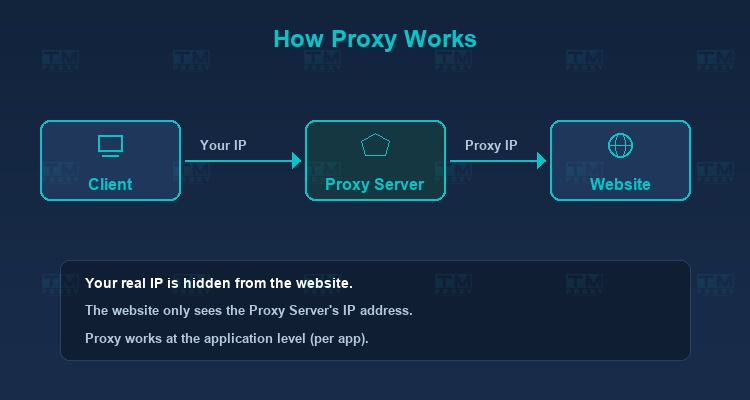 A proxy (or proxy server) is an intermediary server that sits between your device and the internet. When you send a request to access a website, the request first goes through the proxy server, which then forwards it to the target website on your behalf. The target website only sees the proxy's IP address, not your real one.