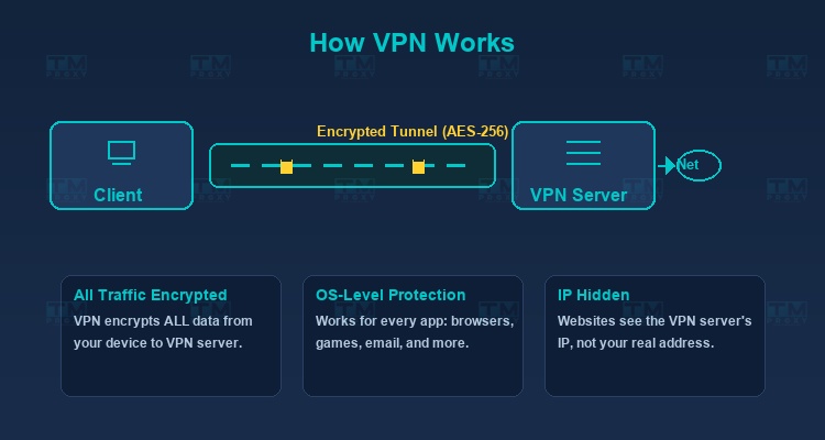 Unlike proxies, VPNs operate at the operating system level, encrypting all traffic from every application on the device.