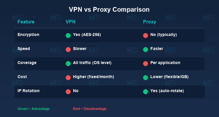 Conclusion: VPN and Proxy are both useful tools for protecting privacy and changing IPs, but they serve different purposes. VPN is best for comprehensive personal security, while Proxy is the optimal choice for web scraping, managing multiple accounts, and automation tasks. Understanding the differences will help you make the right decision for your specific needs.