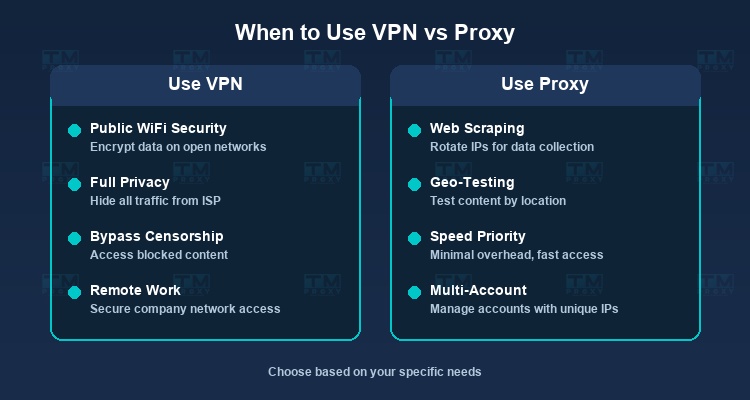 In reality, VPN and Proxy serve different purposes and in many cases complement each other. VPN is great for personal security, while Proxy excels at data collection and multi-account management. Many professionals use both simultaneously.