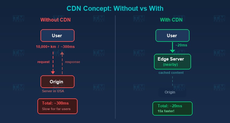Without CDN: The request must travel from Vietnam to the US, fetch the data, and return — a distance of tens of thousands of kilometers, with response times of 200-500ms.