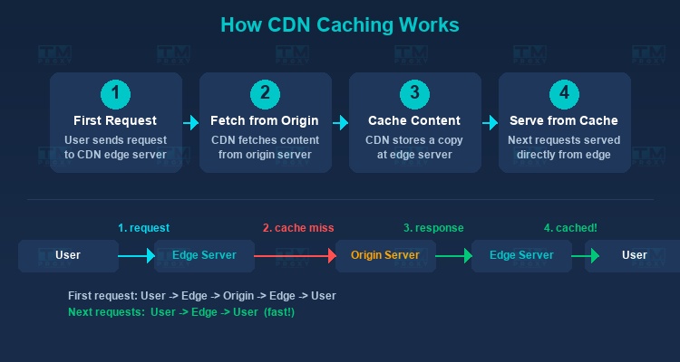 When the first request for content arrives, the CDN fetches it from the origin server, stores a copy at the nearest edge server, and delivers it to the user. Subsequent requests for the same content are served directly from the edge server without going back to the origin.