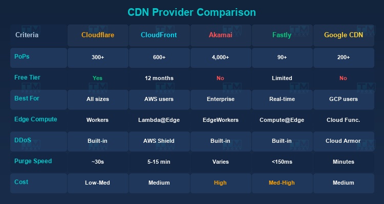 | Criteria | Cloudflare | CloudFront | Akamai | Fastly | Google CDN |