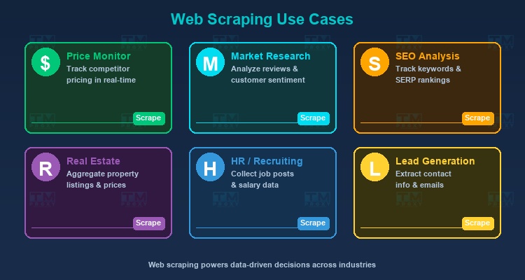 E-commerce businesses use scraping to track competitor product prices in real-time, allowing them to adjust their pricing strategies accordingly.