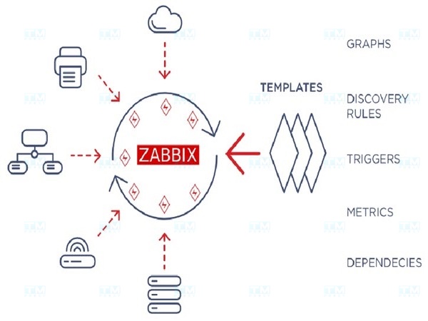 - Templates: Pre-defined templates containing items, triggers, and graphs for quick configuration across multiple devices.